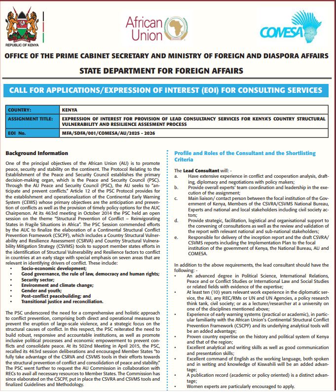 Expression of Interest for Provision of Lead Consultancy Services for Kenya’s Country Structural Vulnerability and Resilience Assessment Process.